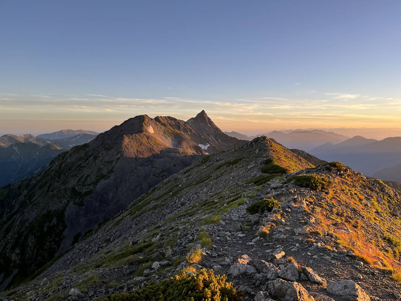 モルゲンロートから少しずつ明るく照らされていく三嶺への縦走路。標高2000mに満たない稜線ながらも、展望は一級品なので稜線好きの方はぜひとも歩いてみてください。