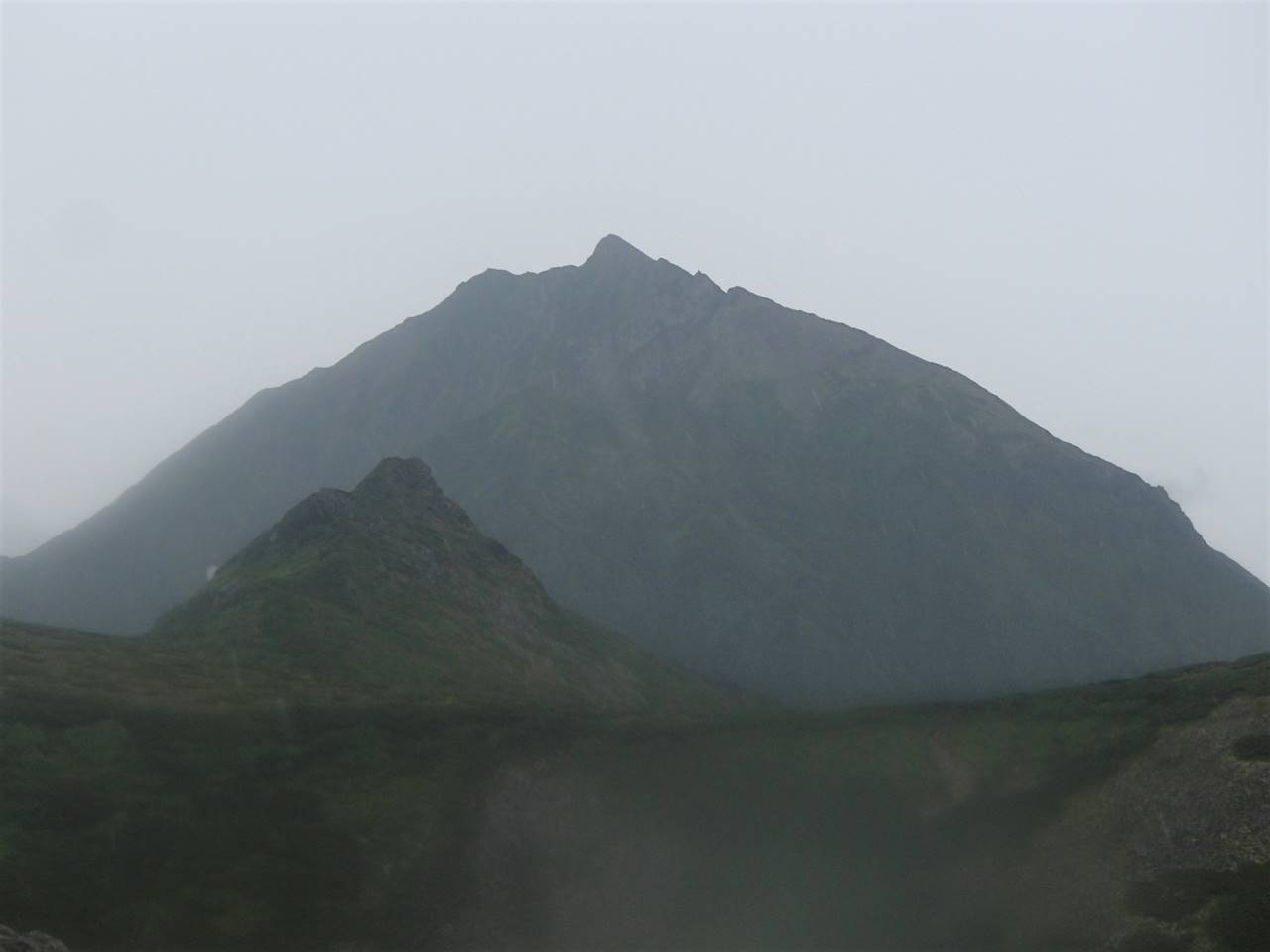 昼ご飯を食べ終えて前掛山へ。荷物はシェルターに置いていきます。雨はほとんどやみましたが、ガスがひどくなっちゃいました。。