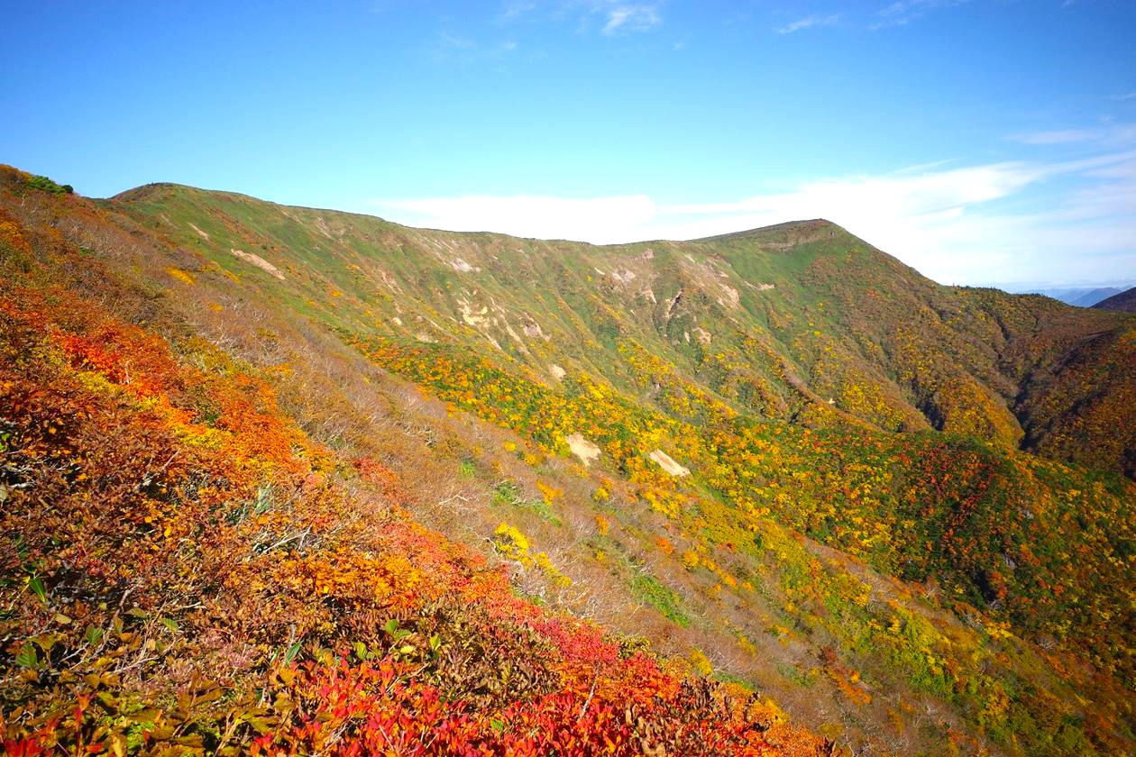 穏やかな稜線と派手な紅葉風景、これぞまさに東北の山という感じ。
