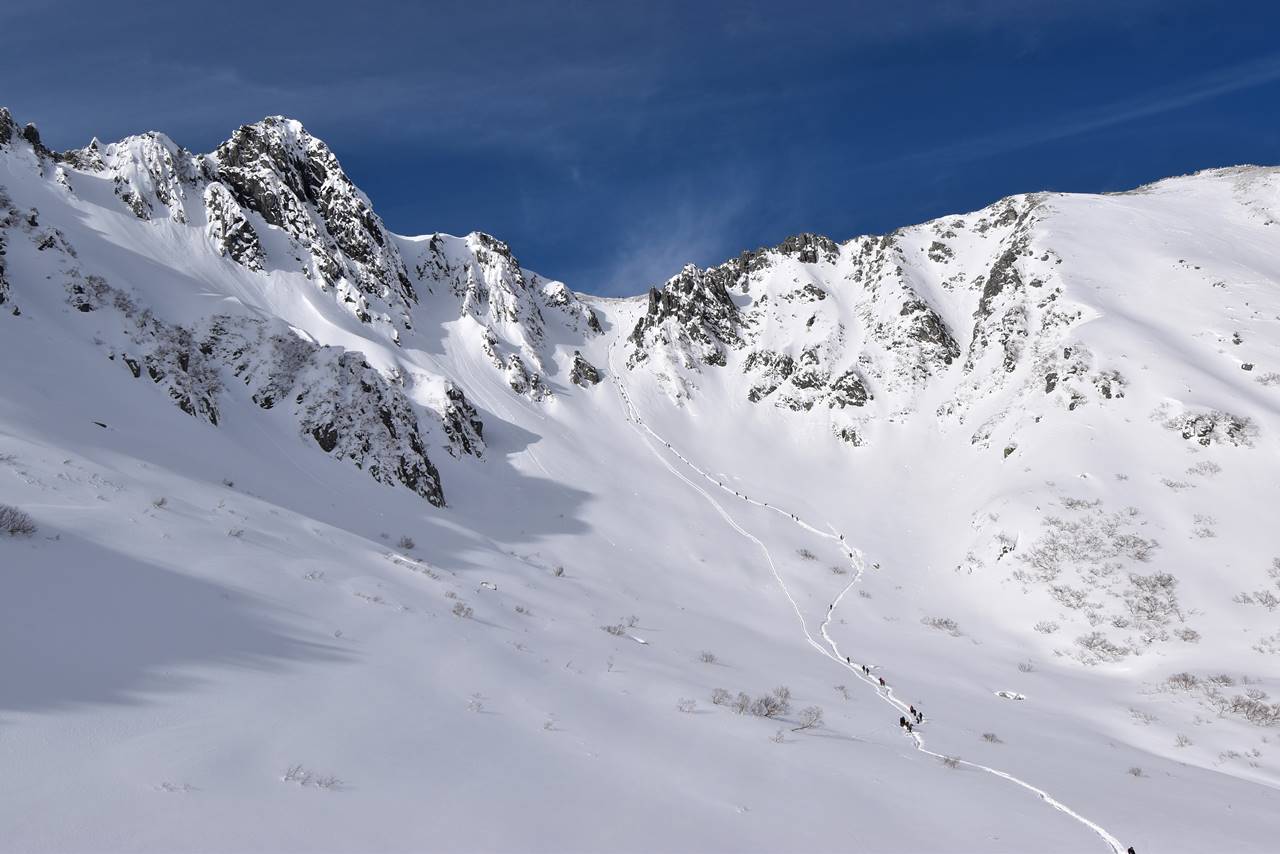 特にこの右に見える尖った岩のあたりが斜度が最もきつくて、雪崩ポイントでもあるので早めに通過したいところ。