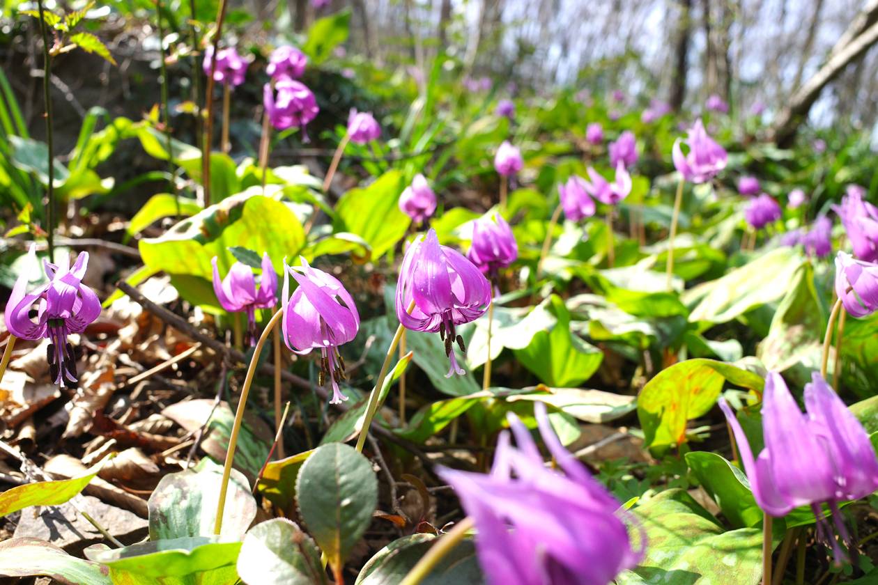 3月下旬はカタクリが満開を迎える季節。日本有数の規模を誇る群生地が一斉に開花する光景は圧巻でした。