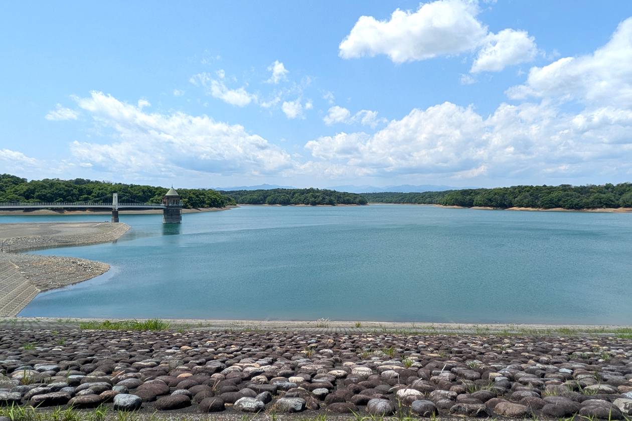 堤防から見ると印象的な塔が湖畔に建てられていますが、あちらは山口貯水池第一取水塔。