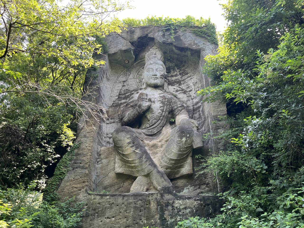 岩に彫られた弥勒菩薩像。山の中に忽然と現れた見上げるほど大きな仏様です。