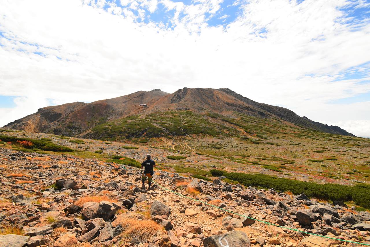 雲と青空と草原が美しい、いかにも夏山と呼べる風景。
