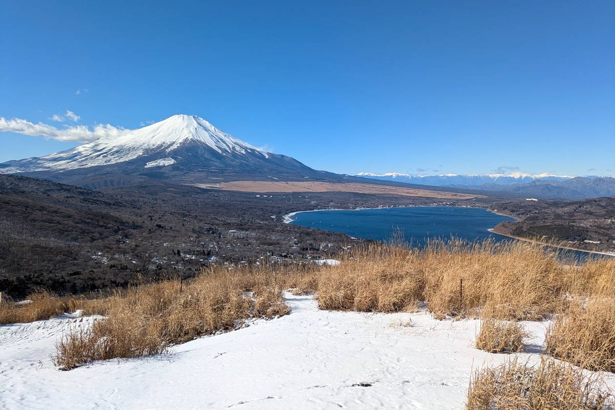 降雪直後で雪道となっていましたが全体的に緩やかな尾根道でとても歩きやすく、特に素晴らしかったのが鉄砲木ノ頭!山頂からの富士山と山中湖、南アルプスの展望が本当に綺麗でした。