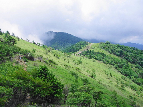 高度が下がると同時に、時間も昼を過ぎてくるので、徐々に蒸し暑くなってきます。早朝から登り始めて正解でした。