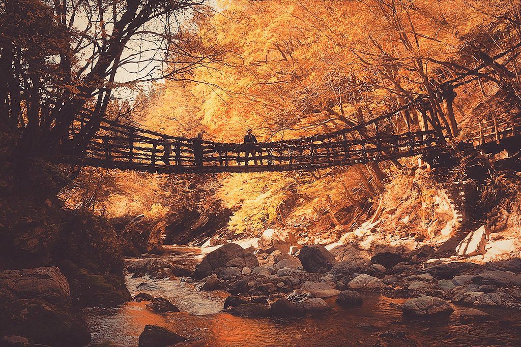 山の上では樹氷が広がる初冬の景色でしたが、麓はまだまだ秋真っ盛りでしたよ!紅葉に伝統的な橋は、まさしく趣のある情景でした。