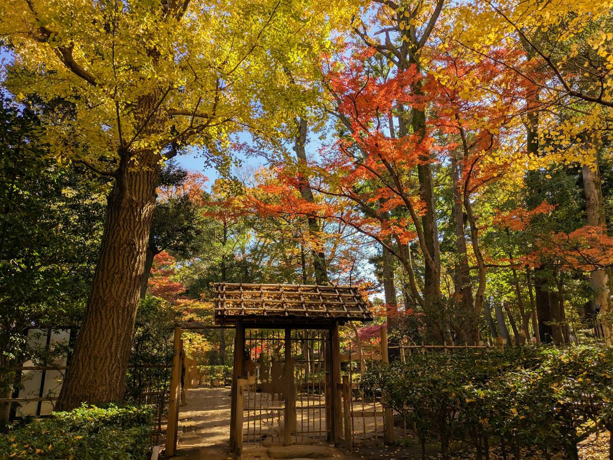 紅葉状況は12月1日時点でちょうど見ごろを迎えていました。残暑の影響で色づきが遅れたようですが、イチョウ並木や池の周りのもみじも華やかに染まり、日本庭園に美しい紅葉風景が広がっていました。